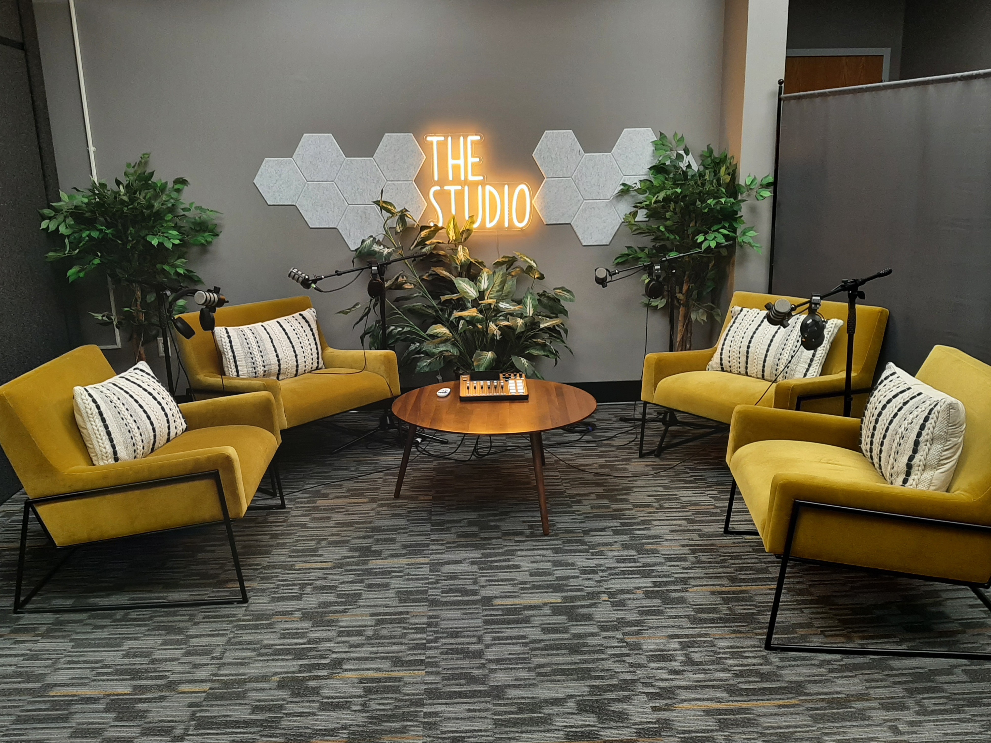 Our podcasting area was designed with aesthetics, comfort, and ease of use in mind. Unlike other academic library A/V studios, we opted for a “living room style” design, which has received great feedback from users.